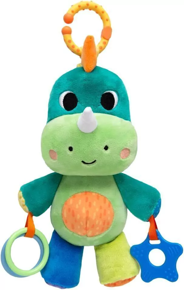 Com suas argolinhas coloridas, enchimento que faz som de amassadinho, buzina e chocalho, além de um mordedor para aliviar o desconforto da dentição, este dinossaurinho é um verdadeiro aliado no desenvolvimento sensorial e na diversão do bebê.